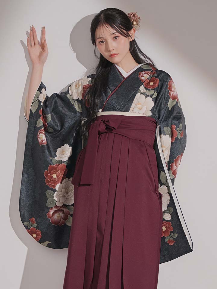 深い黒地に鮮やかな椿柄が凛と咲く、存在感あふれる袴。