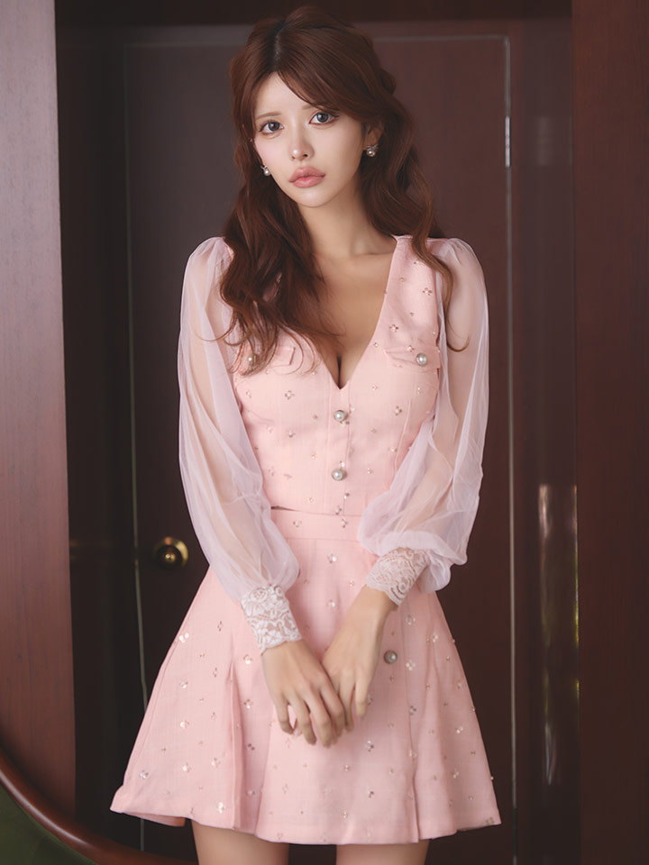 控えめかわいく輝くスパンコールとビーズを散りばめたあざとドレス。