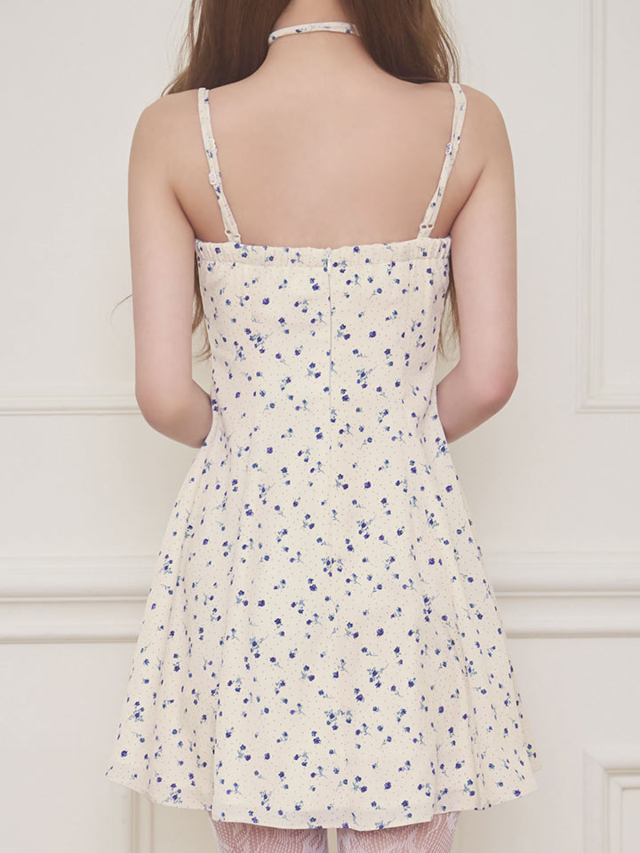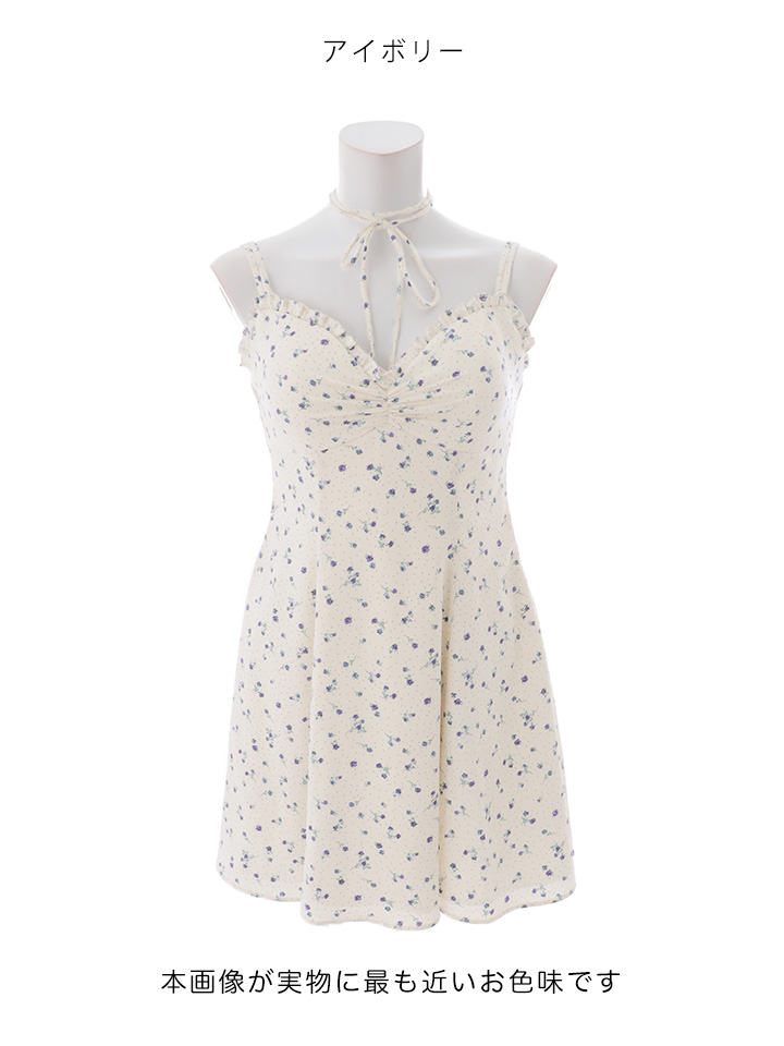 キャミソールデザインのミニドレスは、胸元のフリルとチョーカー風リボンが視線を引くポイント。