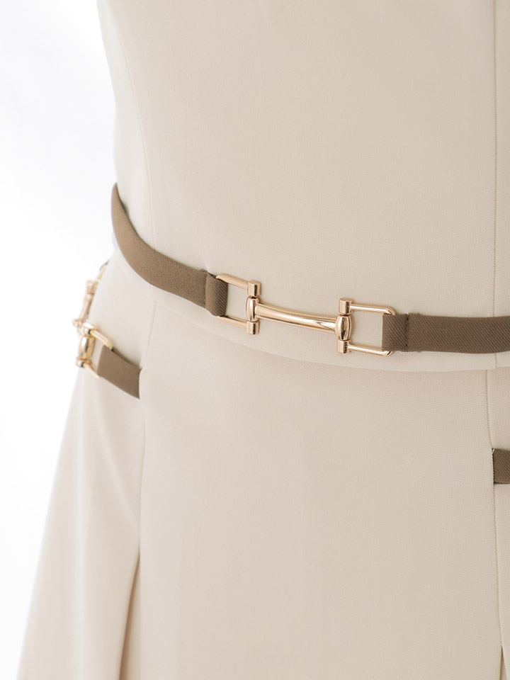 ウエストとスカートのフェイクポケットには、存在感のある配色装飾をあしらい、シンプルすぎない仕上がりに。