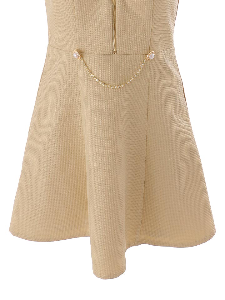 ウエストにはパールボタンとチェーンをあしらい、上品な華やかさをプラス+