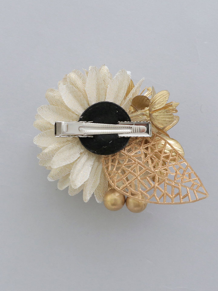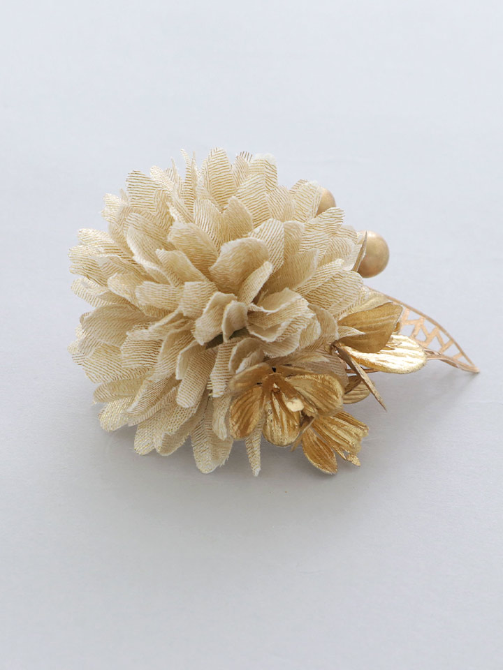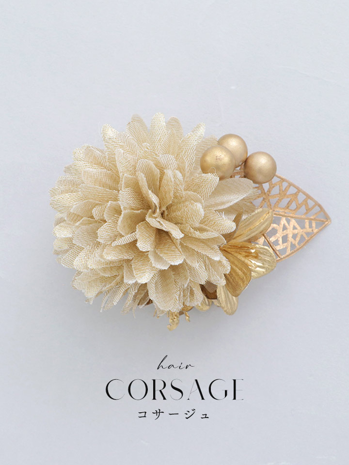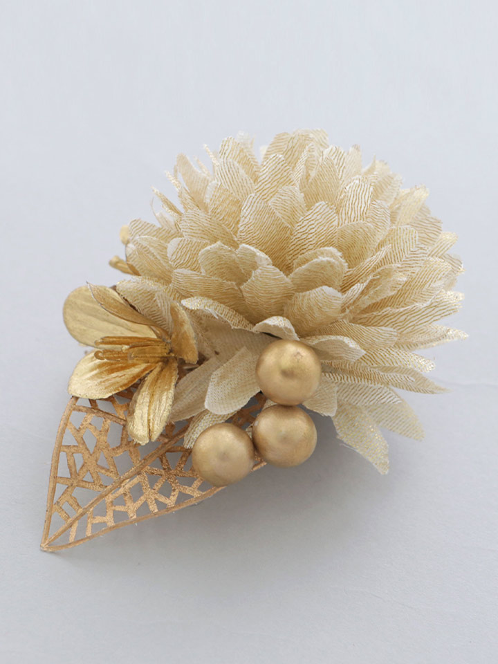 たくさんの花びらとゴールドパールが魅了的なコサージュクリップ式で着脱も簡単!