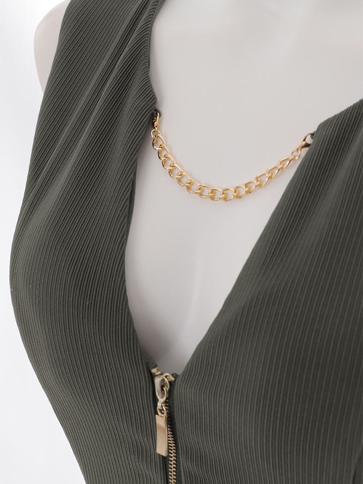 胸元に配置されたゴールドやシルバーのチェーンが、アクセサリーいらずの圧倒的な存在感を放ちます。