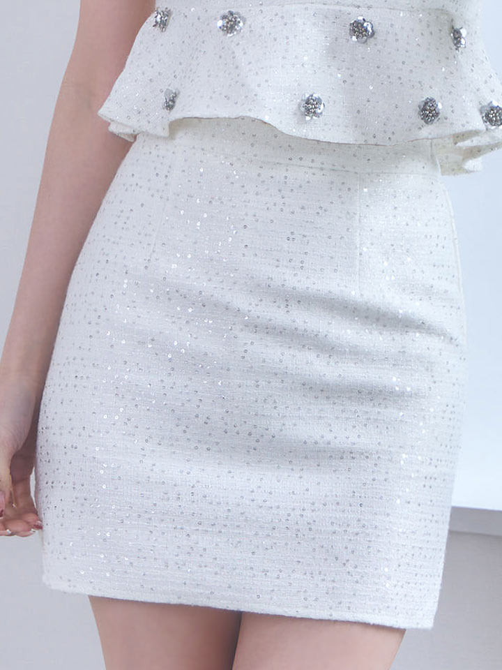 胸元のビジューとトップス裾のお花スパンコールが可愛らしさを引き立て、 タイトなシルエットで甘すぎず大人っぽく着こなせる一着。