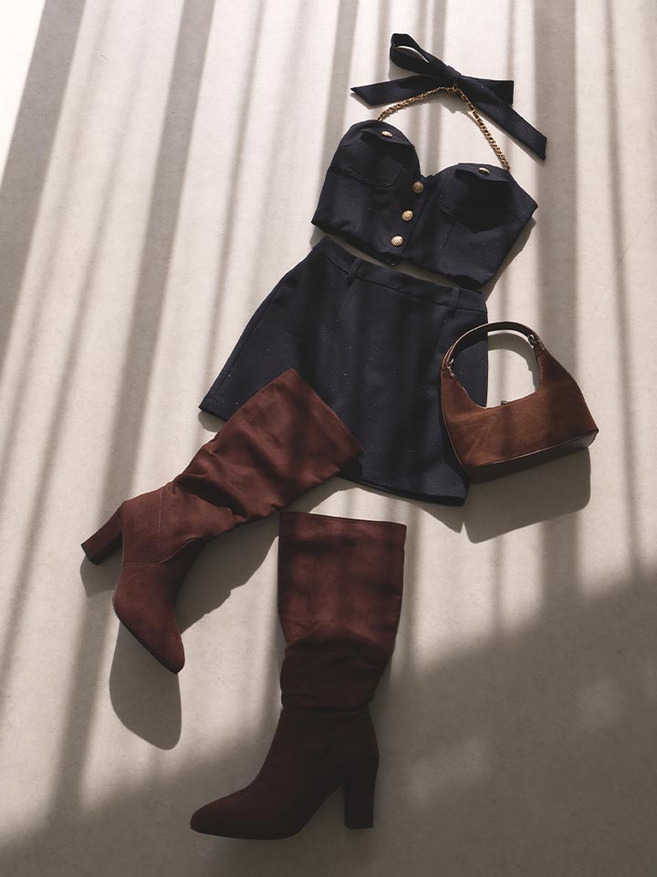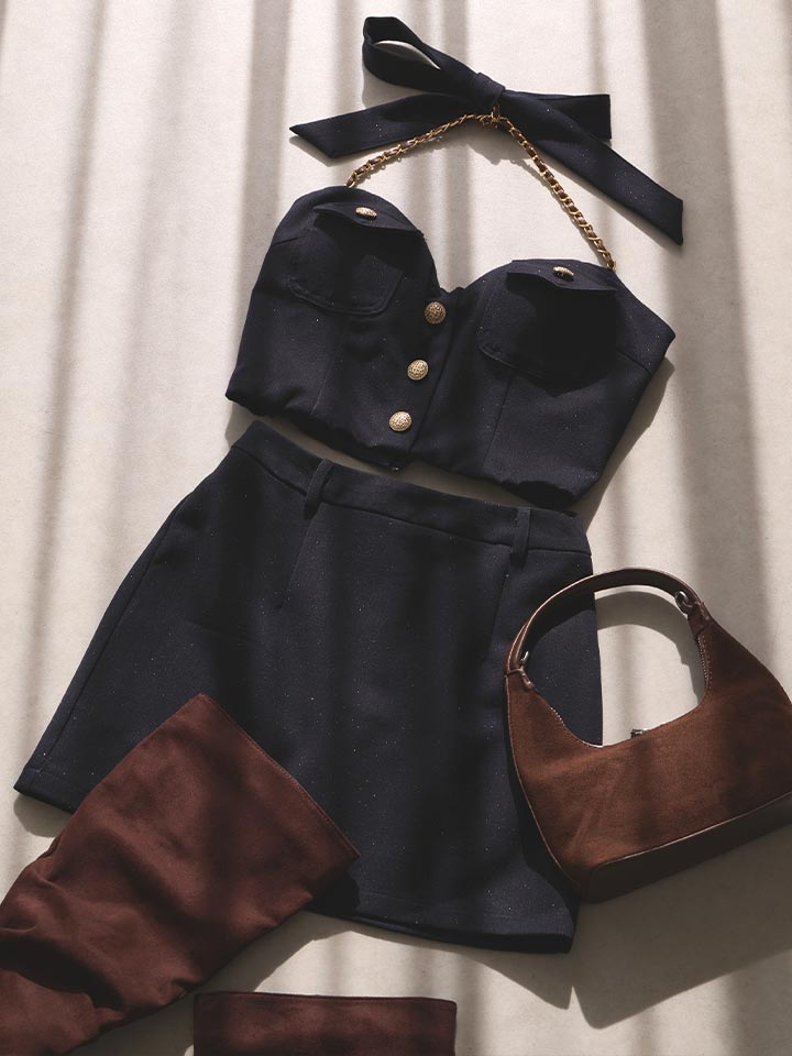コンパクトなトップスとミニ丈ボトムのバランスがスタイルアップを叶えつつ、