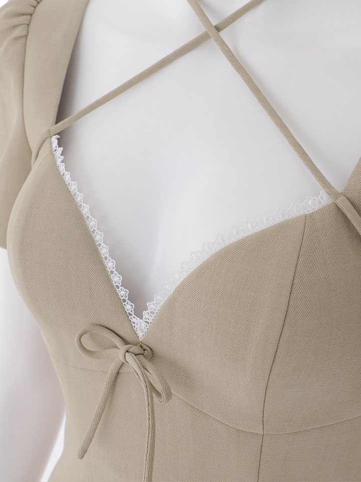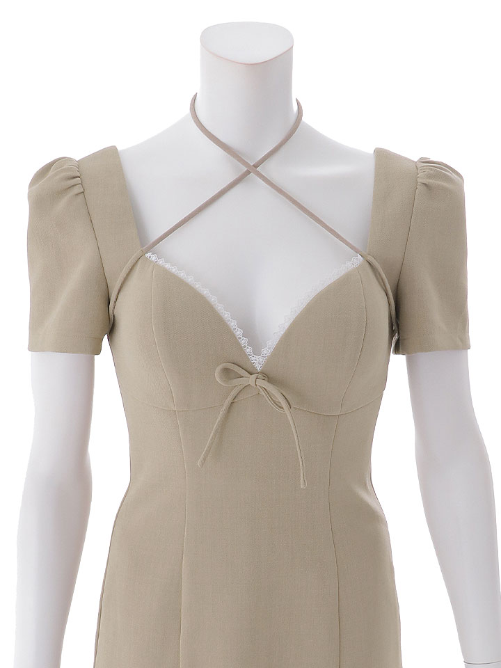 胸元のクロスデザインに紐アクセントを添え、谷間をきれいに見せつつ程よい色気をプラス。