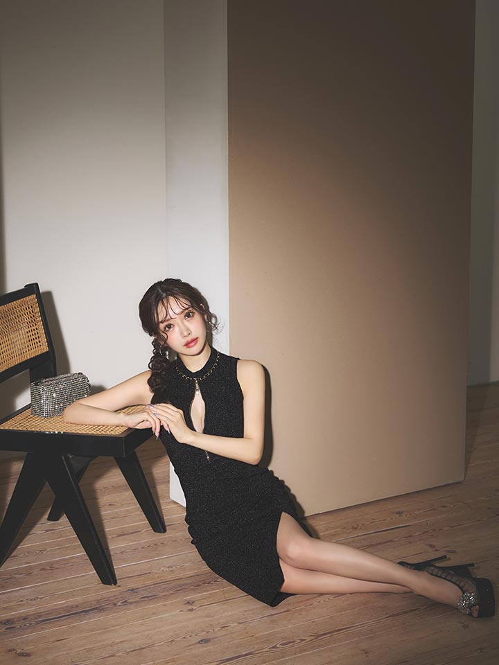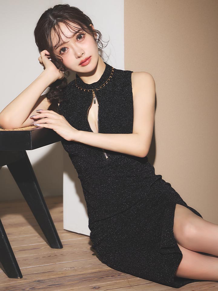 胸元のジップラインが、シンプルなミディアムドレスにアクセントをプラス。