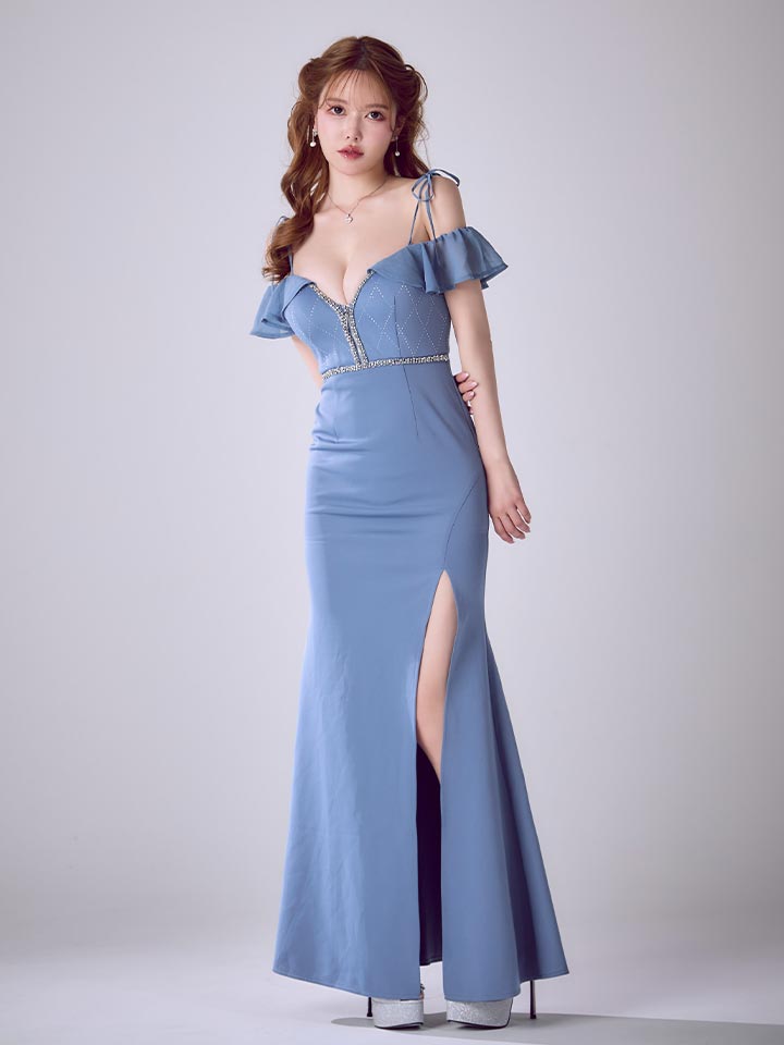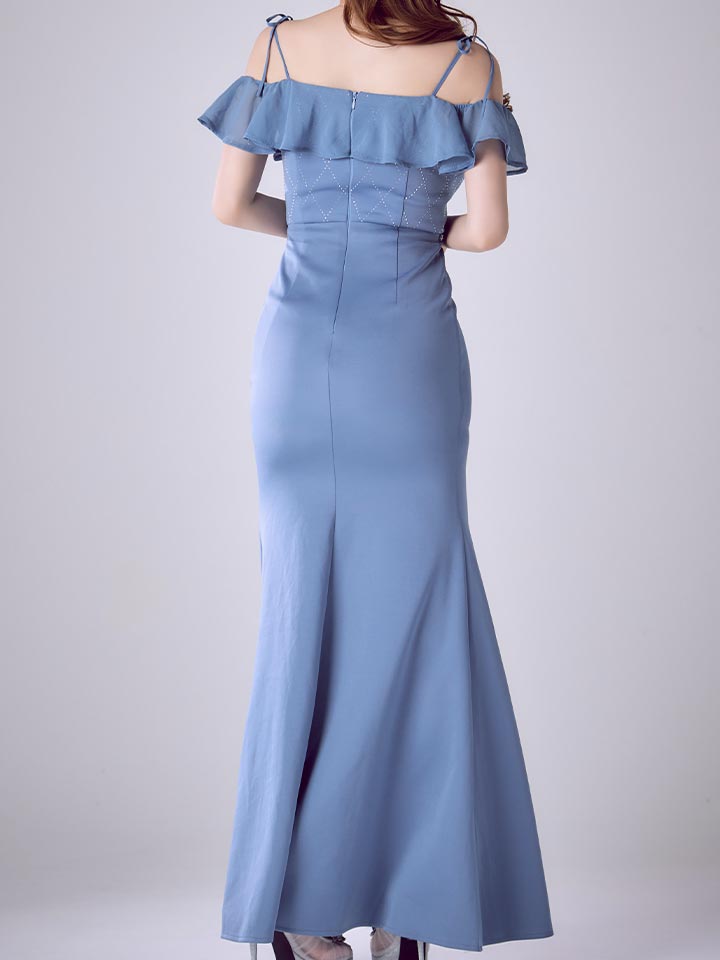 フリルをあしらったオフショルデザインが目を引くロングドレス。
