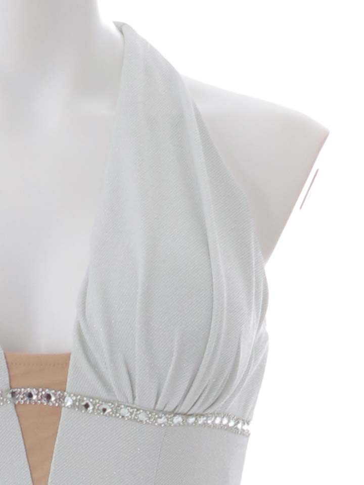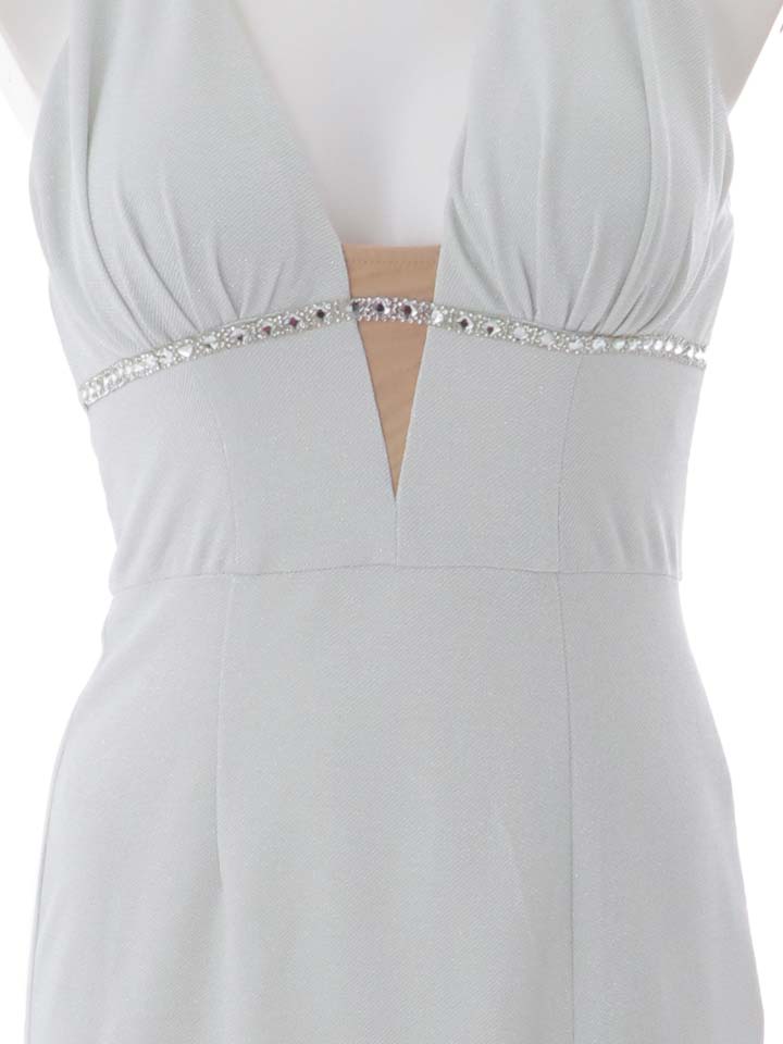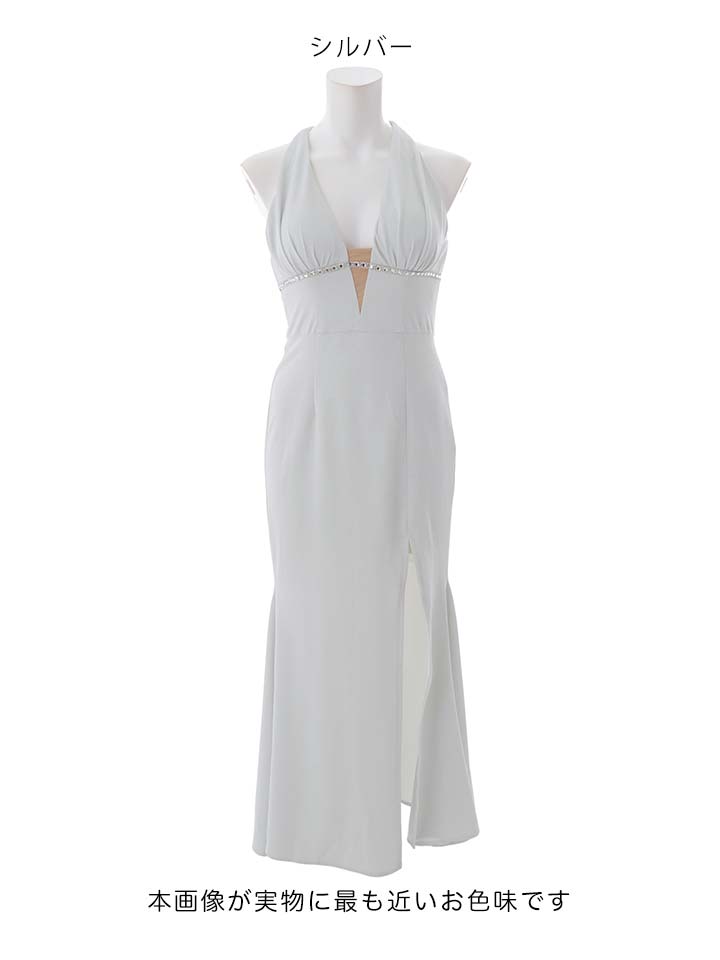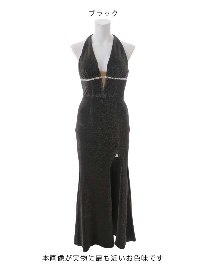 ラメのストレッチ生地が上品に輝き、深めスリットと谷間見せで大人の色気をバランスよく演出してくれます。