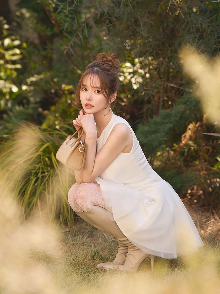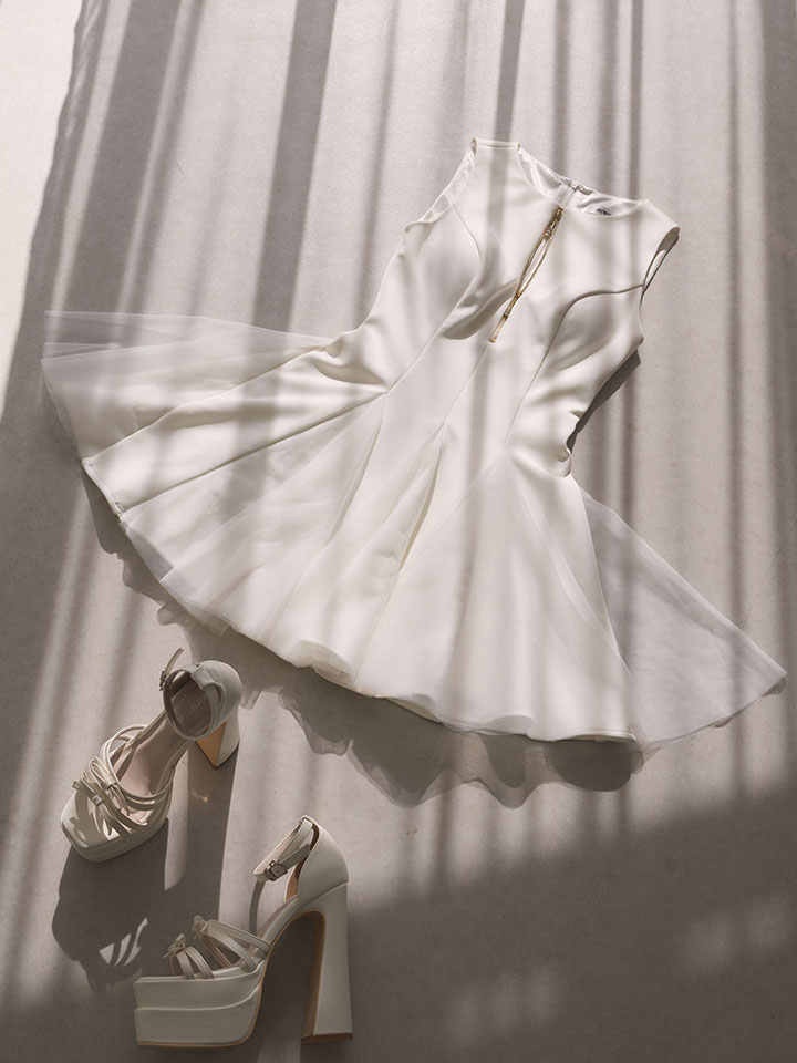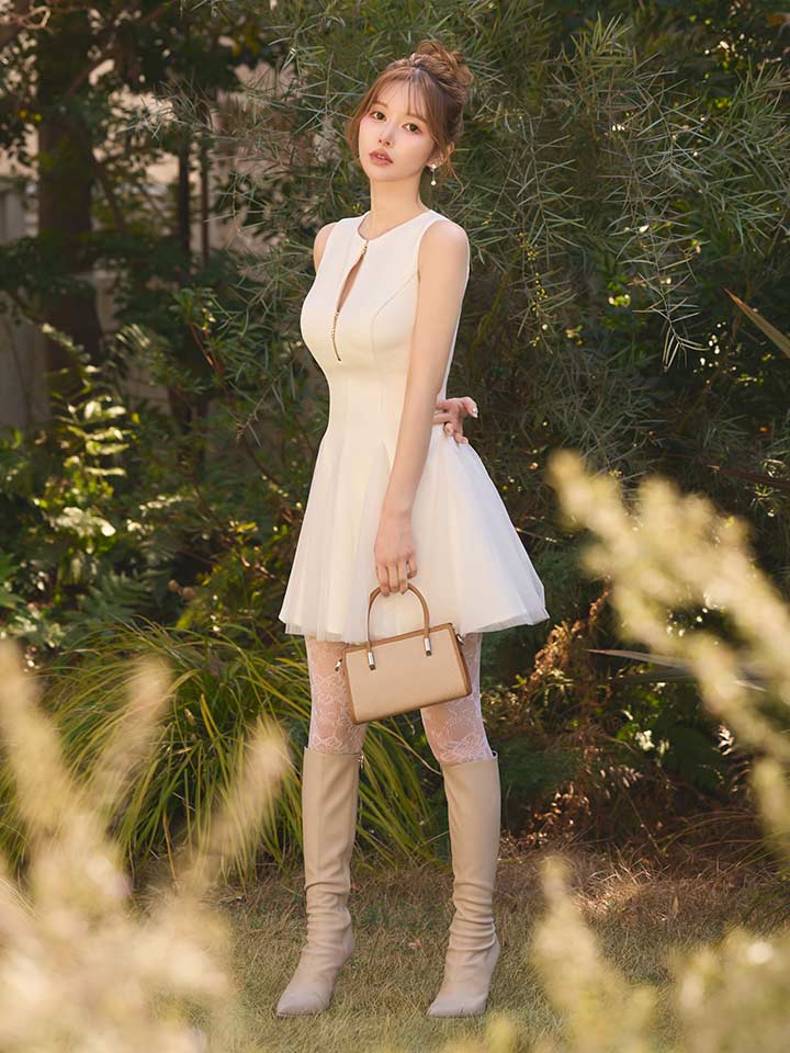 シルエットの美しさが際立つフレアミニドレス。