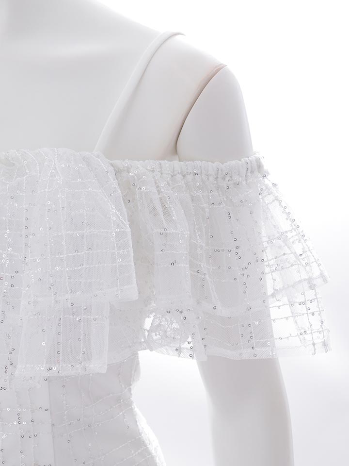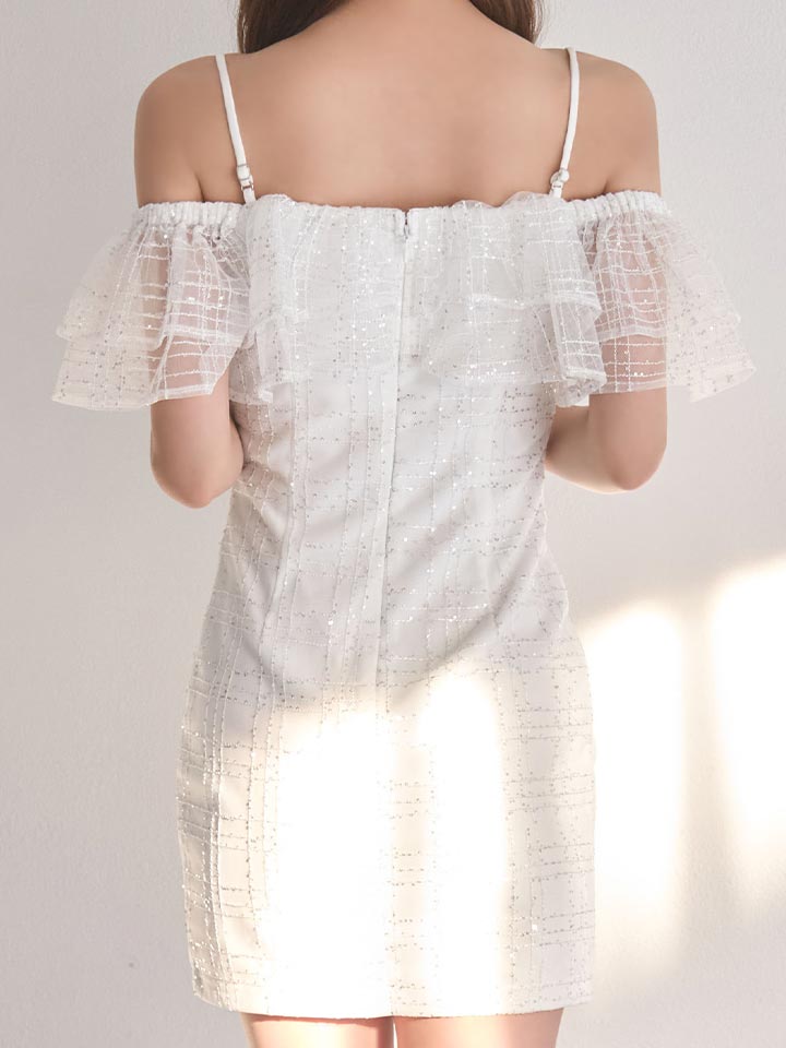 オフショルダーでデコルテを綺麗に魅せる、春らしいシアードレス。
