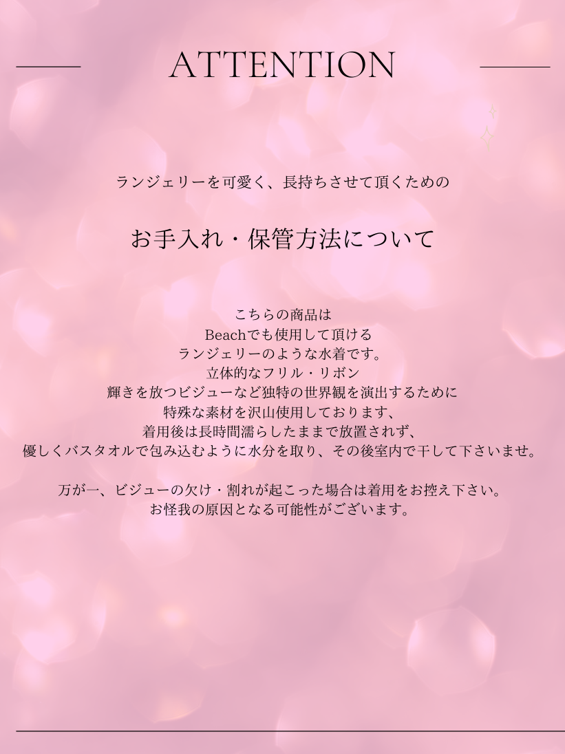 ▼こちらのランジェリーは撮影・イベント用にデザインされた物です。通常のお洗濯はして頂けません。▼商品の特性上、生地の取り位置により柄の出方・ニュアンスなど多少の個体差が生じ、画像と表情が異なることがございます。