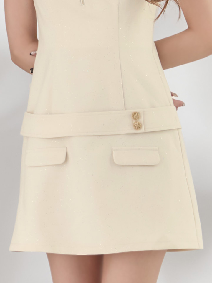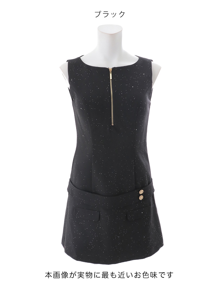 キラキラスーツ生地の上品な輝きと、胸元のジップ仕様で自由に雰囲気を変えられるのもポイント。