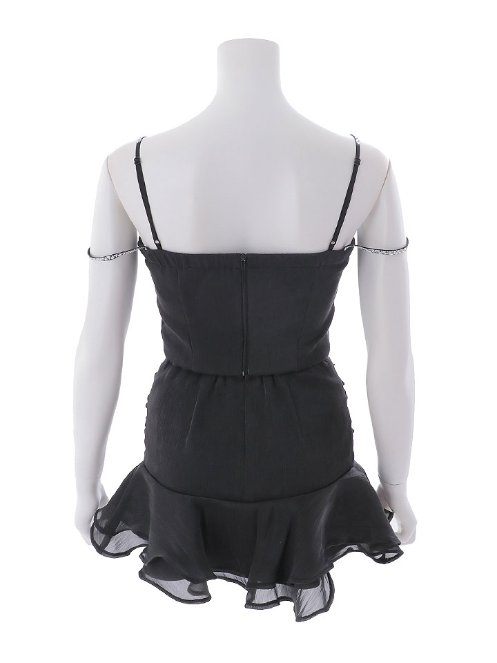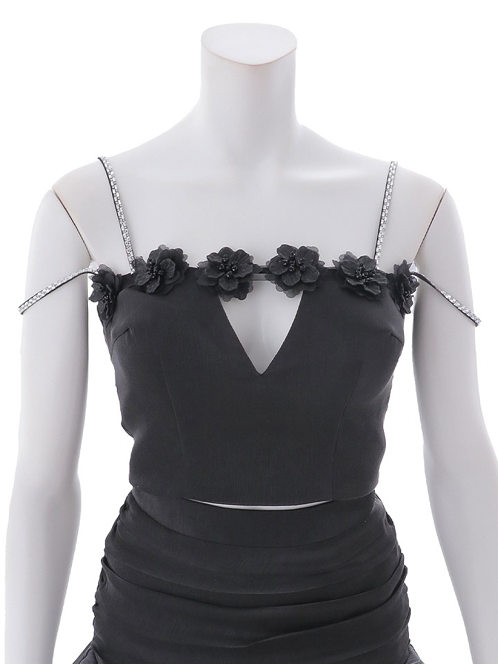 胸元のお花の装飾が華やかさを添え、二の腕のチェーンが煌びやかでかわいらしいアクセントに。
