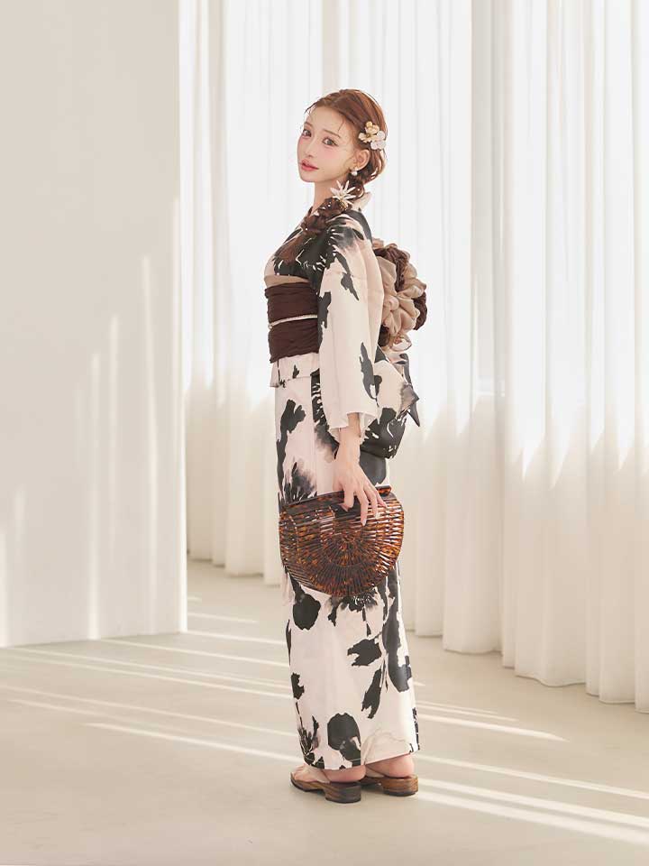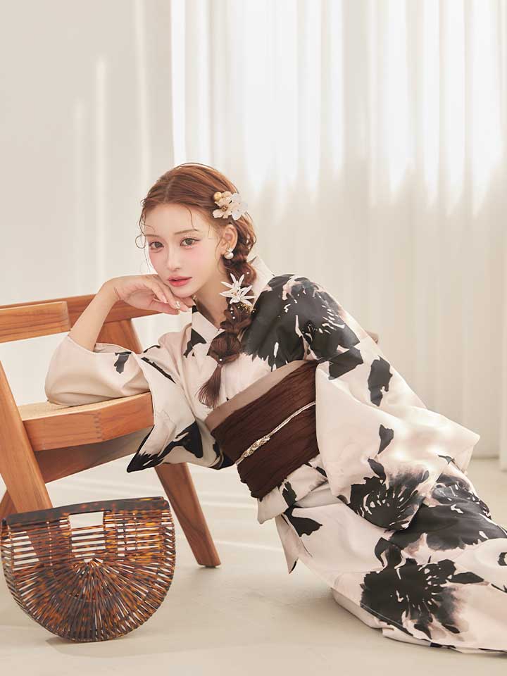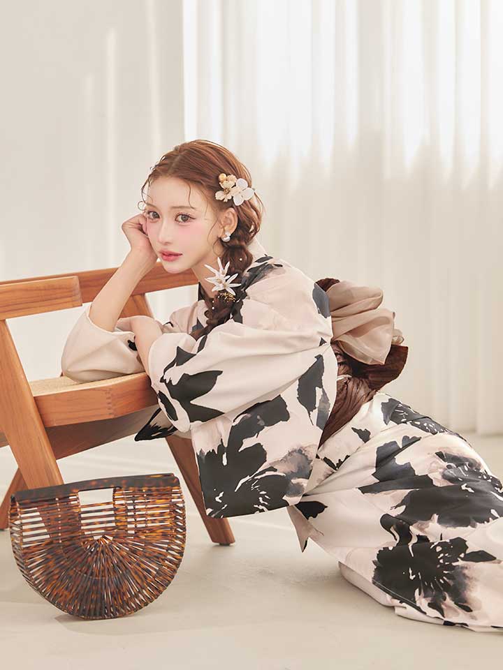 墨色の花が美しく咲き誇る、和の趣あふれるモノトーン浴衣。