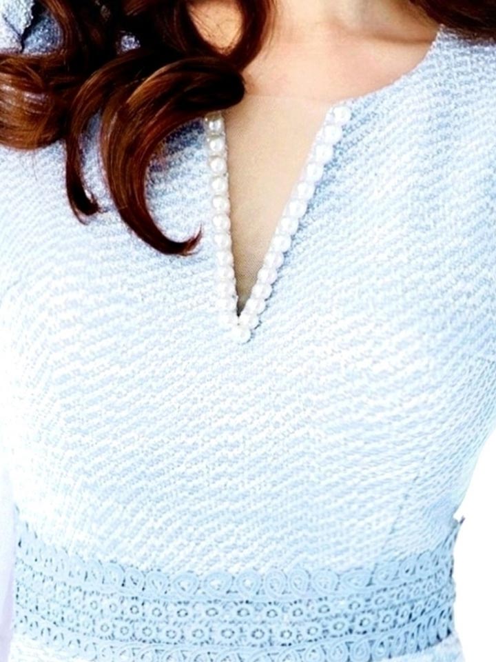 ツイード生地と胸元のパール装飾が上品な印象のミディアムドレス。