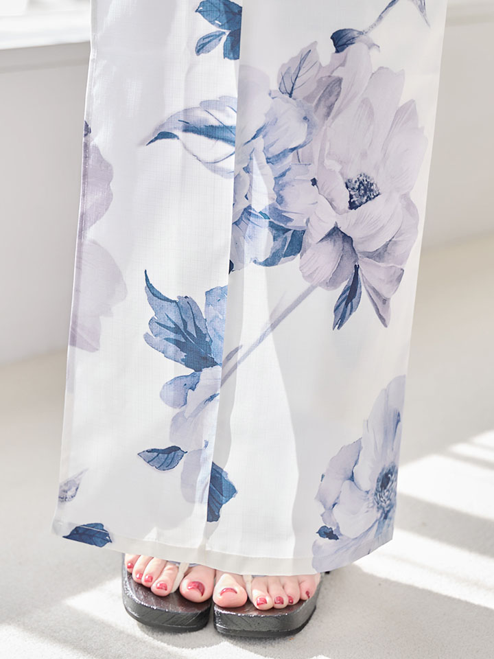 清らかな白地に、凛と咲く蒼色の牡丹を描いた気品あふれる浴衣。