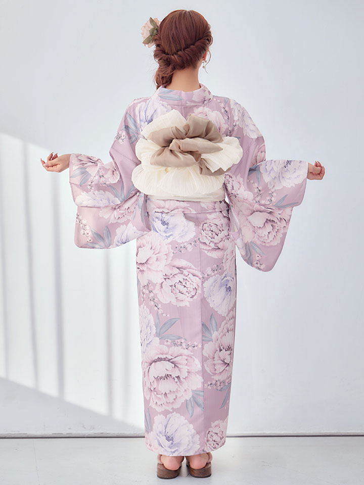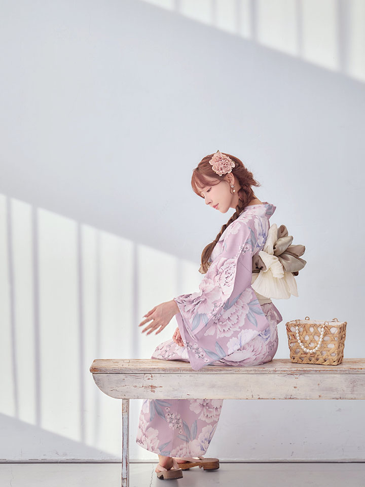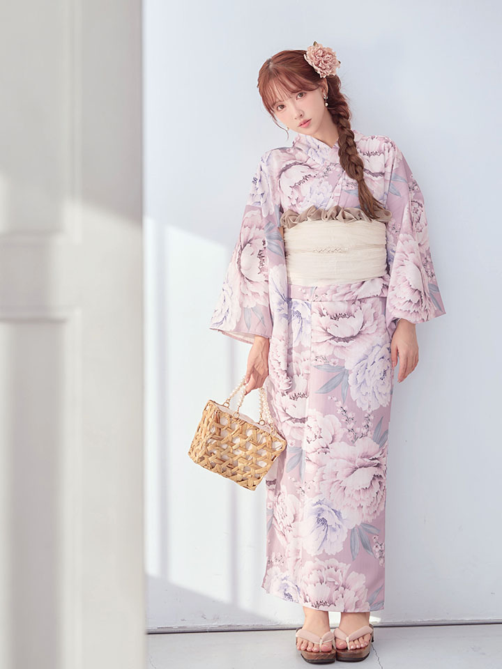 大輪のピオニーフラワーが浴衣の装いを華やかに演出。愛らしさをプラスするピンクの夏浴衣です。