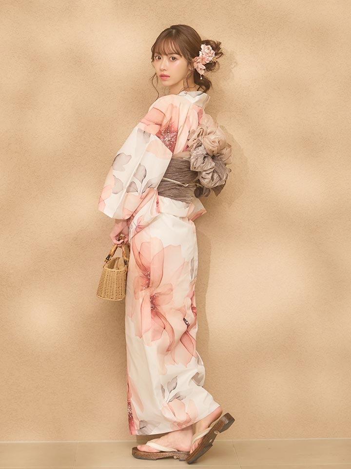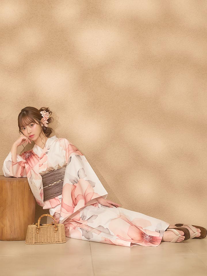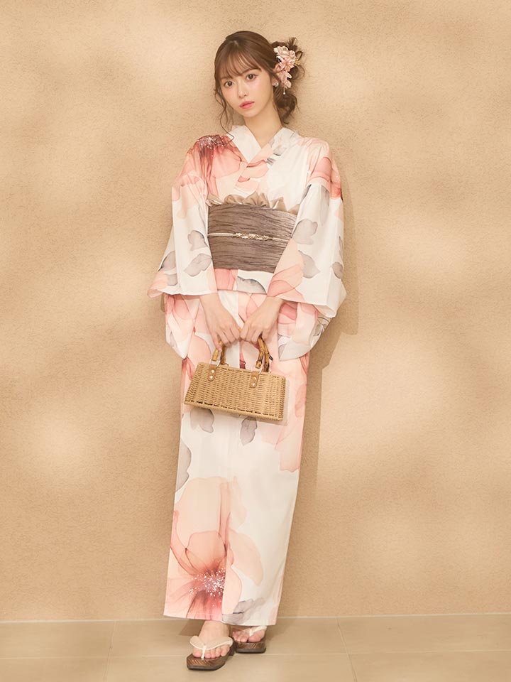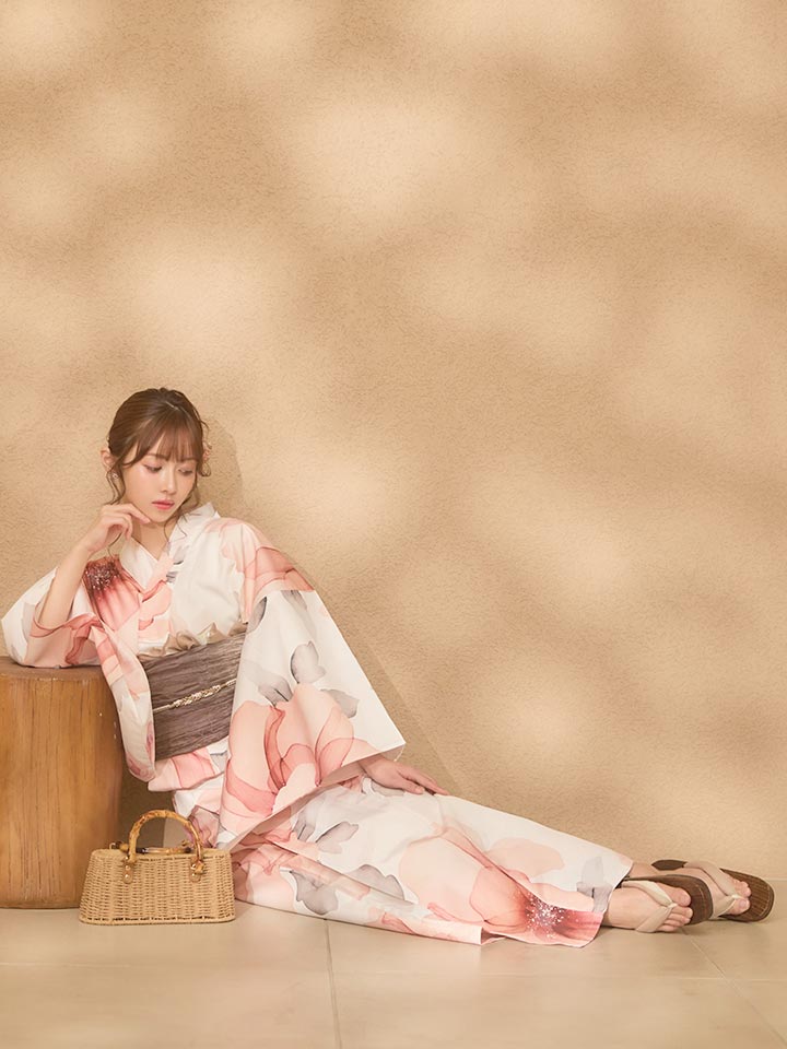 ふんわりとしたソフトコーラルカラーの花が、甘すぎない大人可愛い浴衣です。