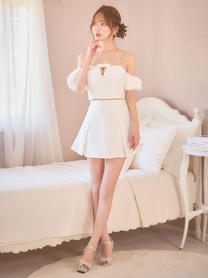 オフショルダーのパフスリーブがフェミニンな雰囲気を漂わせる2ピースのミニドレス。