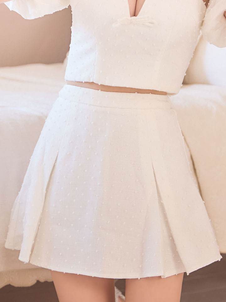 ビジューの肩紐がきらめきを添え、ボックスプリーツが揺れるたびに華やかさをプラス。