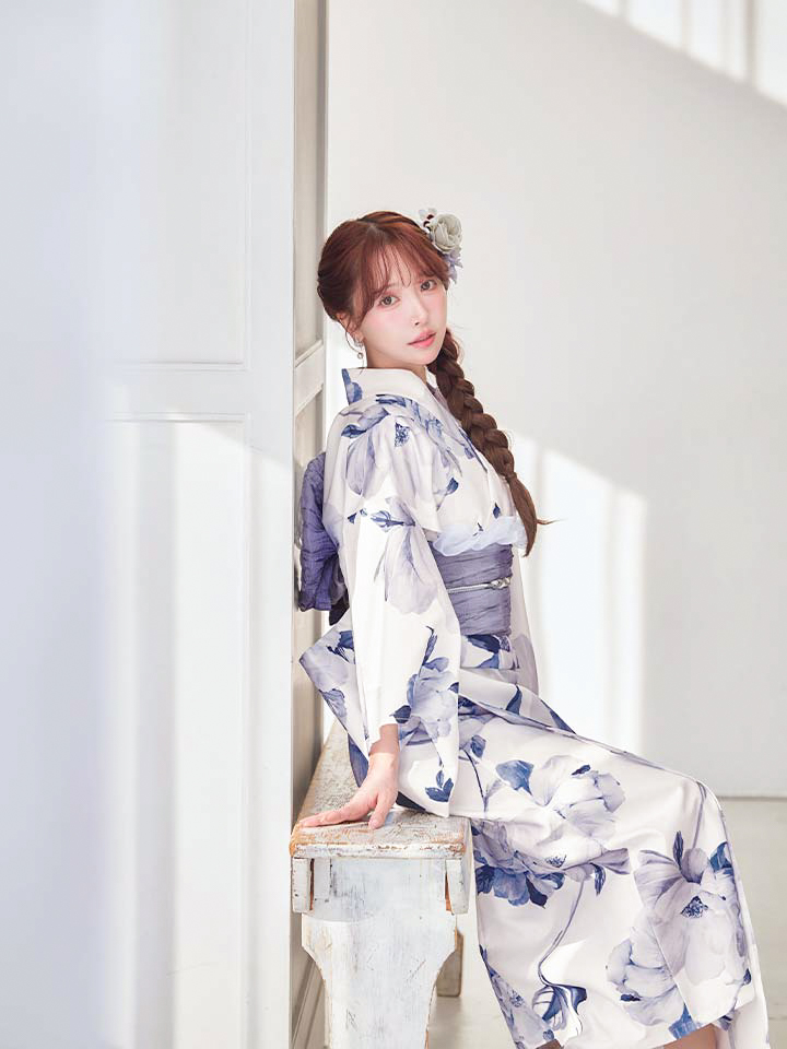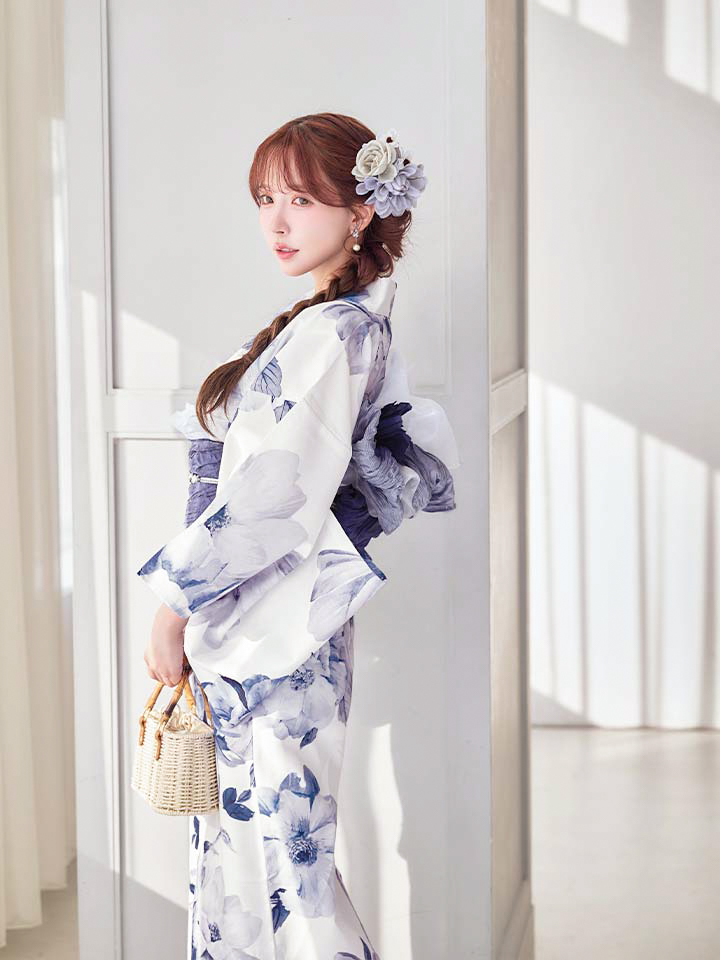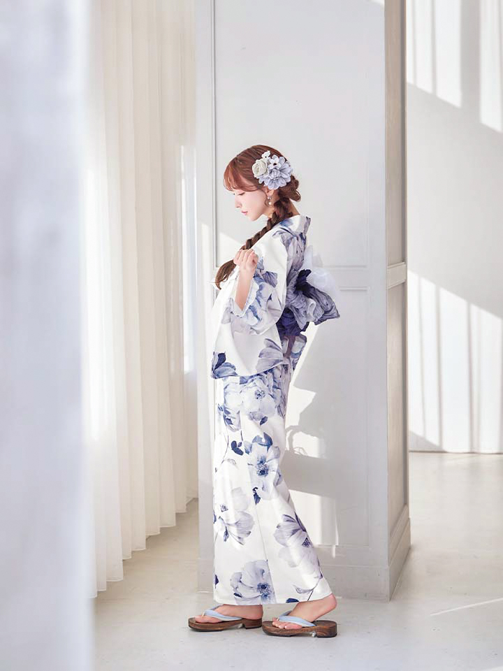 清らかな白地に、凛と咲く蒼色の牡丹を描いた気品あふれる浴衣。