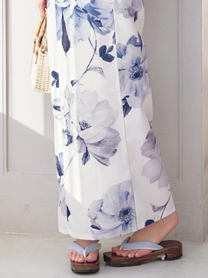 涼やかなブルーの花模様が、夏の装いに透明感と