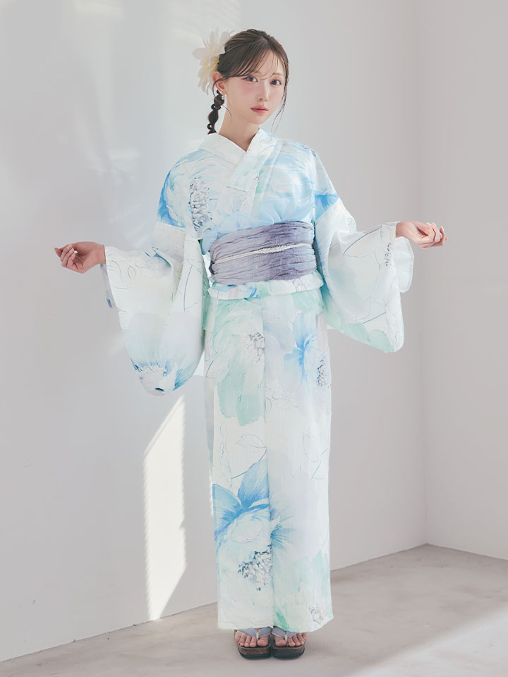 爽やかなミントとベビーブルーの色味がたまらない清涼感溢れる水彩大柄浴衣。