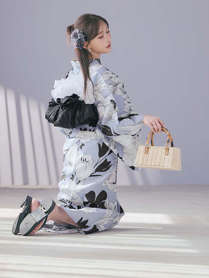 ブラックとホワイトで描かれた花柄が印象的な浴衣。