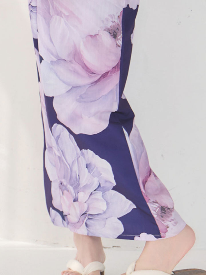 ネイビー地に淡色で描かれた大輪のピオニーが