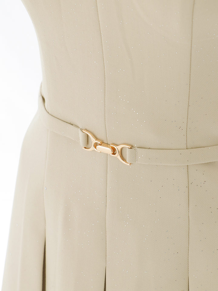 シンプルなデザインながら、ウエストの金具アクセントがさりげなく目を引き、洗練された雰囲気を演出します。