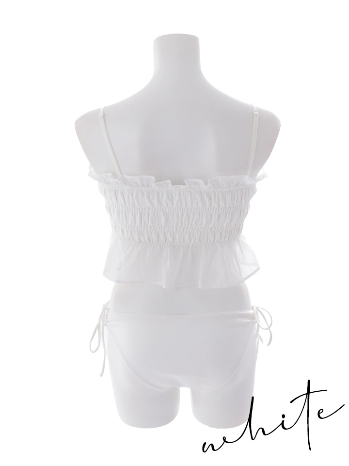 柔らかなシフォン生地が軽やかに揺れる、大人のためのベアトップスイムウェア。