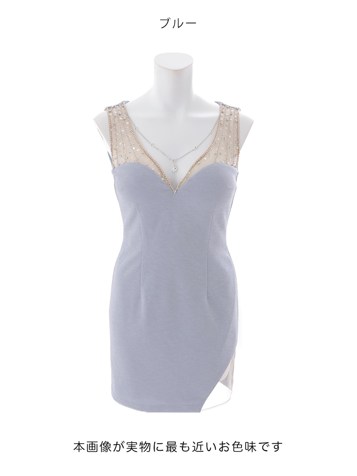 胸元にあしらわれたビジューがデコルテを華やかに魅せ、谷間を美しく演出。