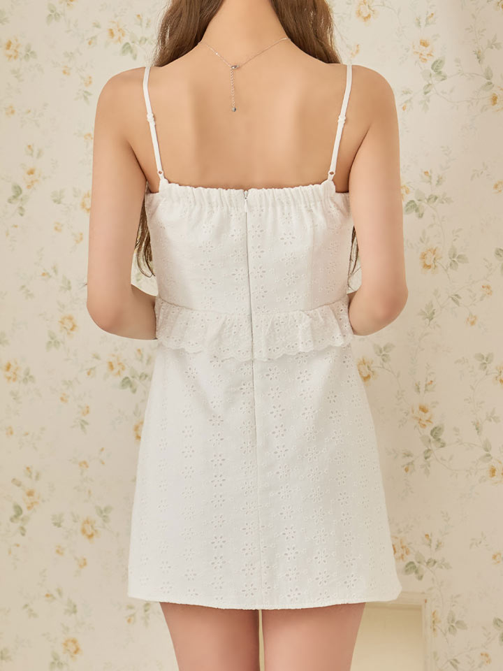 キャミソールタイプの軽やかなワンピースに腰フリルをあしらったフェミニンなデザイン。